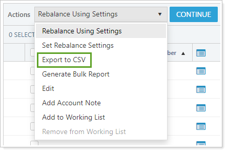 Export to CSV lets you select an account or accounts and export the column data you see to a comma-delimited (.csv) file.