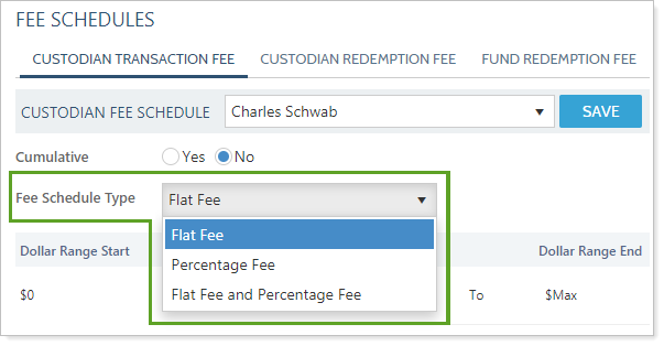 When setting up a fund's redemption fees or a custodian's transaction and redemption fees on the Fee Schedules page, Fee Schedule Type lets you specify the type of fee charged for each transaction.