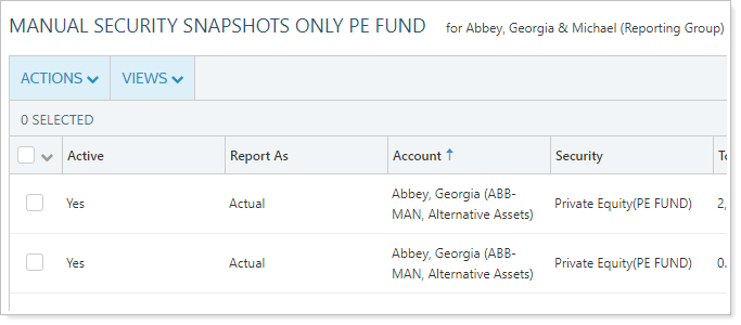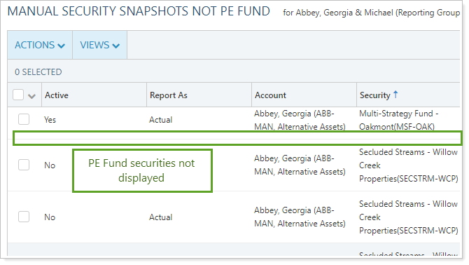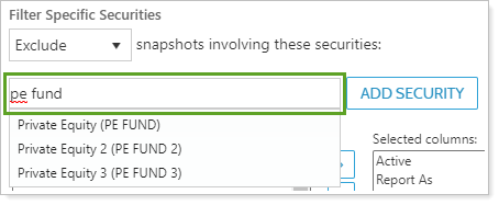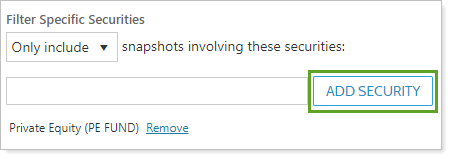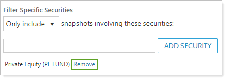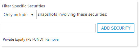 Only include. The page displays only manual security snapshots for the security or securities you add to the list. For example, if you add PE Fund, you see only manual security snapshots for the manual security PE Fund, any other snapshots.