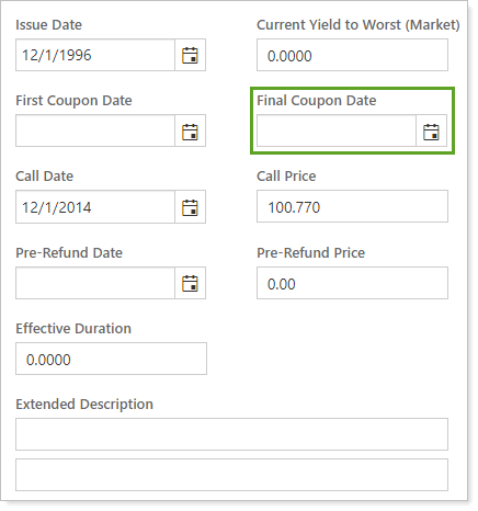 This securities setting allows you to set the date of the final coupon payment. Enter a date only if the security's payment cycle does not occur at regular intervals with respect to the maturity date.