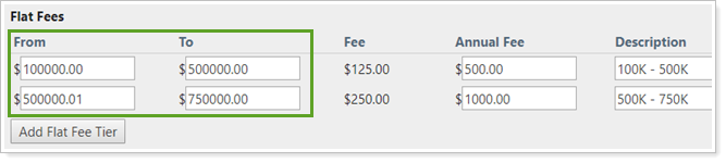 When you add a new tier, the From field automatically generates at the previous To rate plus $0.01. However, for flat fees, you can change the From amount to any dollar value.
