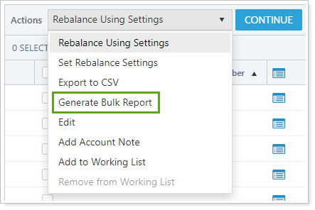 Generate Bulk Report lets you select an account or accounts and generate a bulk report using data only for the account or accounts you've selected.