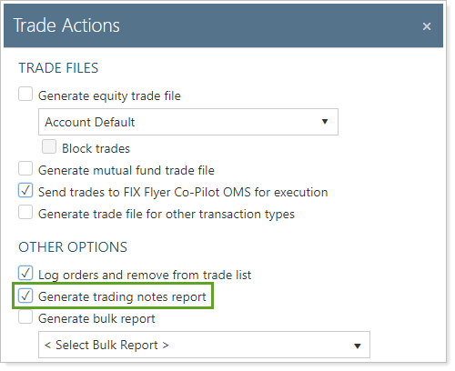 Generate trading notes report appears on the Trade Actions dialog box on the Trade List page when you create trade files or send trades to FIX Flyer for execution, and then log those orders. When you select this check box, Tamarac Trading will generate the trading notes bulk report when you log orders. If no trading notes exist, the generated file will be empty.