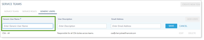 Use this service teams setting to set the name for the generic user. This name appears in all lists where you assign generic users to service teams, so it's best to use a descriptive name. The user name must be unique, but you can assign multiple users to the same role.