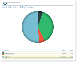 This setting allows you to add shading to charts in PDF reports. It does not change the gradient or color of the background in the chart, but instead adds a gradient to the actual chart elements themselves—the bars in a bar chart, or the pie slices of the pie chart.