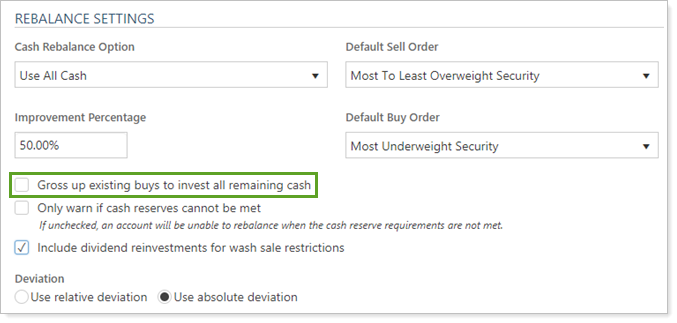 Rebalance Settings on the Rebalancing System Settings page allow you to customize how Tamarac Trading adheres to logic during a rebalance and how it calculates information during that process. These settings are widely applicable to many different rebalance types. Gross up existing buys to invest all remaining cash controls how Tamarac Trading treats excess cash during a rebalance.