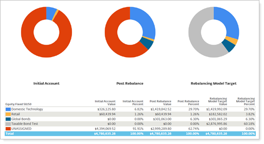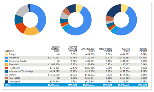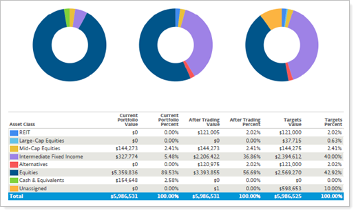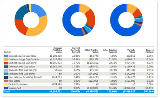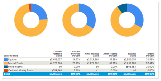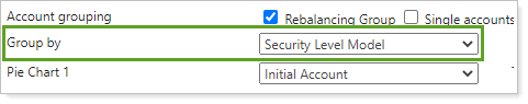 Groups holdings in the pie chart by security level model. Use this option for internal firm audits to evaluate the impact of rebalancing and to see what areas of a portfolio may be out of tolerance.