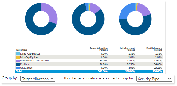 Group by in the Rebalance Summary Charts PDF report controls how securities in the shown in the PDF template section's pie charts are grouped.