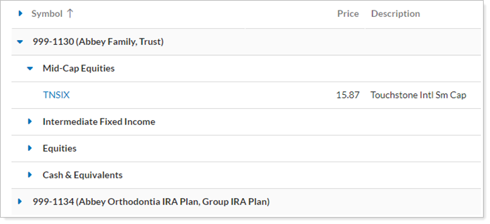With this grouping, the report groups by account first, then by the asset classes held within each account. You can expand or collapse each account and asset class to view details.
