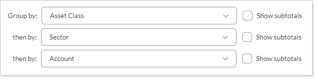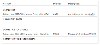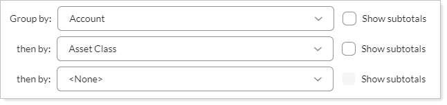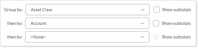 With this grouping, the report groups by asset class first, then by the account that holds each asset class.