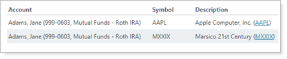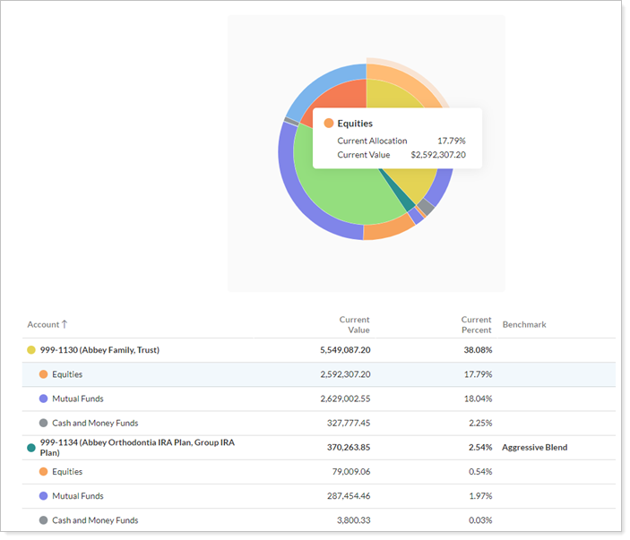 With this grouping, the report groups by account first, then by the security types held within each account. You can click on the chart or in the table to see more details and highlight the data.