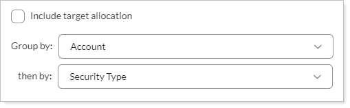 If you want to see an Asset Allocation report showing what accounts in an a group hold which security types, you can apply the following Group by settings:
