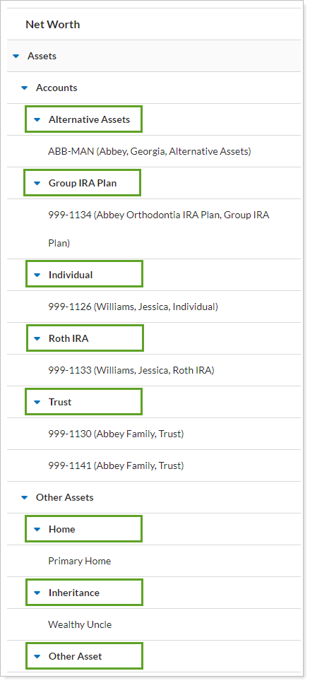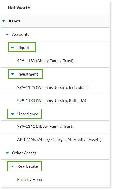 Net Worth Category. See all accounts, assets, and liabilities sorted based on the Net Worth Category setting. Anything not assigned a net worth category is displayed under Unassigned.