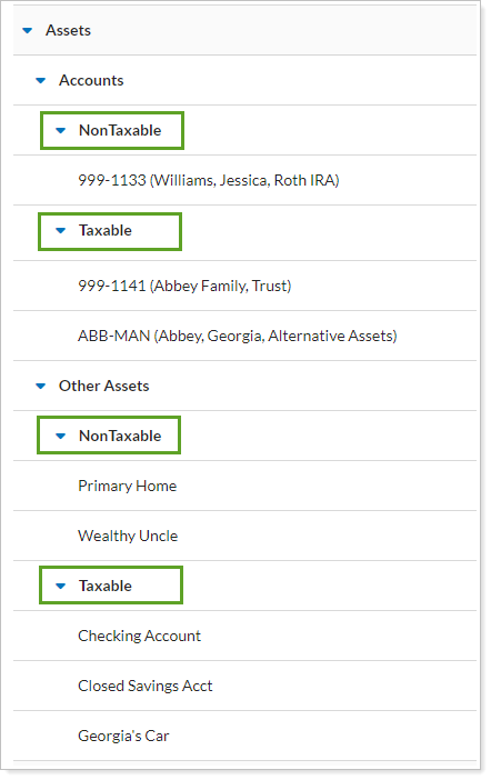 Tax Status. See all accounts, assets, and liabilities sorted based on the Tax Status classification.