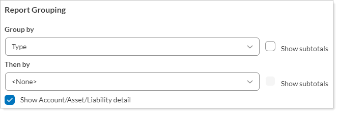 On the Net Worth report, Group By/Then By allows you to choose how the table groups assets and liabilities.