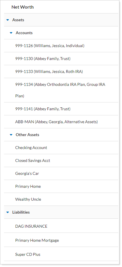 For more information about the Net Worth report, see Net Worth report.