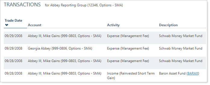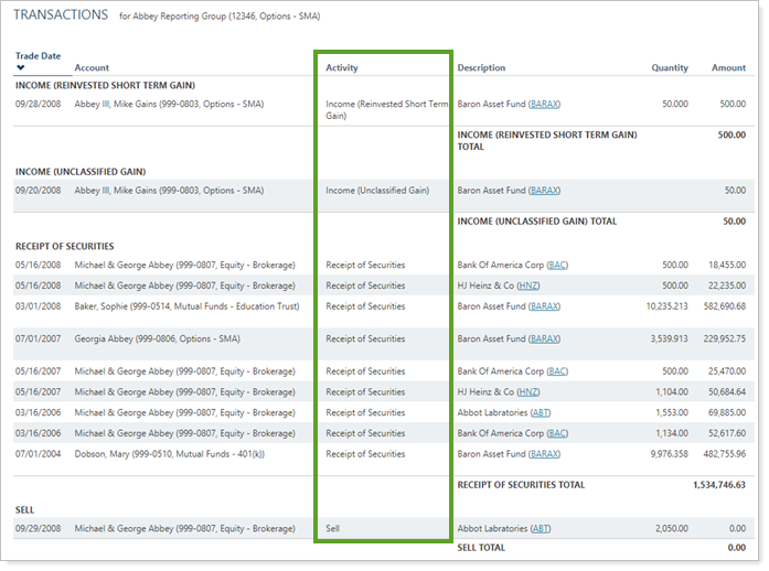 In this example, transactions are grouped first by activity and then by trade date. Subtotals are provided for each activity type.