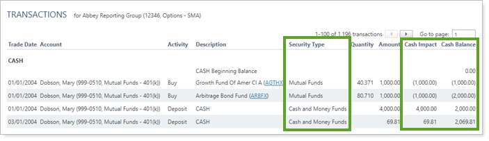 In this example, transactions are limited to only cash securities, and the Cash Impact and Cash Balance columns are added, showing the impact of each transaction as it occurs.
