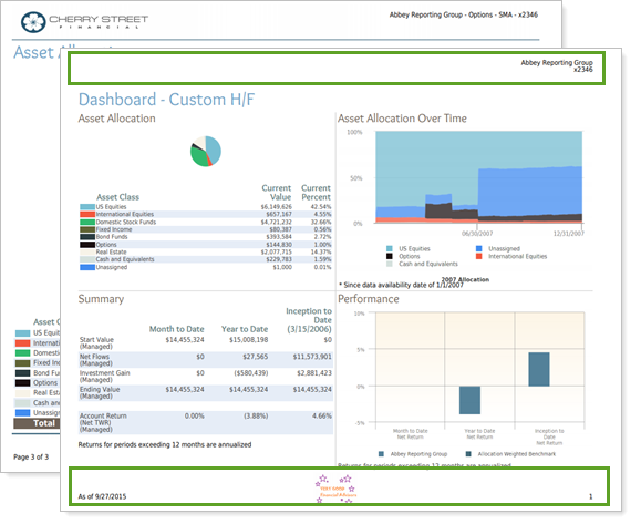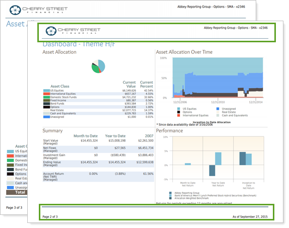 For example, if the Theme for the Dashboard section to Account, while the rest is set to <Use template theme>, for this report, the header and footer are based on the header and footer determined in the General Settings section. For the Dashboard section, the header and footer has been changed to one called Basic, which displays different information in the header and footer.