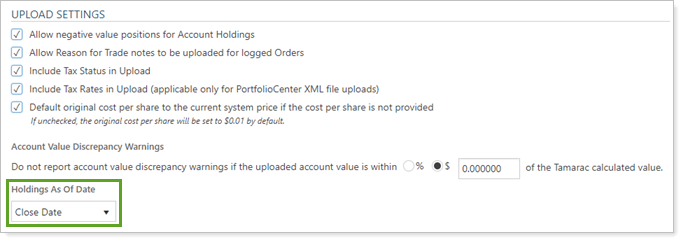 Upload Settings on the Rebalancing System Settings page allow you to change how Tamarac Trading treats some of the information you add through upload. The Holdings As Of Date option lets Tamarac Trading know how to set a pricing date for an uploaded security.