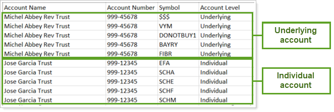 Use this bulk report setting to generate bulk reports from the Rebalance workflow pages that include groups, accounts, or groups and accounts. This gives you a better view of what is happening at the account and group level and surfaces information that you need to ensure trades are accurate.