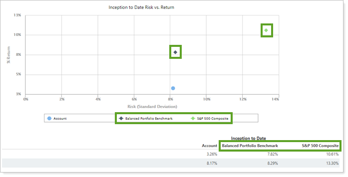To add an index, select the Include additional indexes check box. In the list of benchmarks that appears, click the benchmark you want to add and click Add Index. When you view the chart, indexes will appear as diamonds (◆) and the account and its benchmark(s) will appear as dots (•).