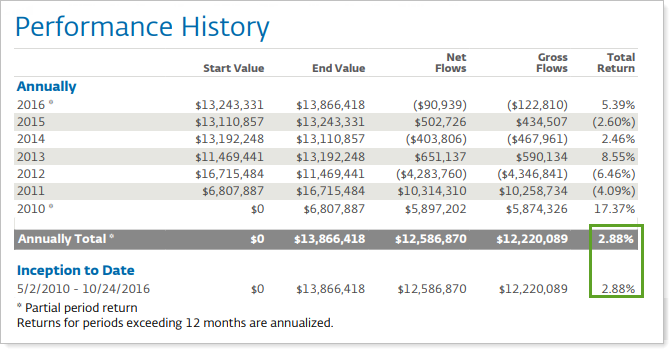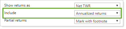 This setting allows you to designate which returns are reported in the Performance History report: Annualized returns, cumulative returns, or both.