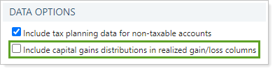 When you set Reporting data type to Tax planning data, the behavior of Include capital gains distributions in realized gain/loss columns changes slightly.