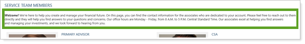 For example, this firm has created a generic welcome message displayed at the top of the Service Team page.