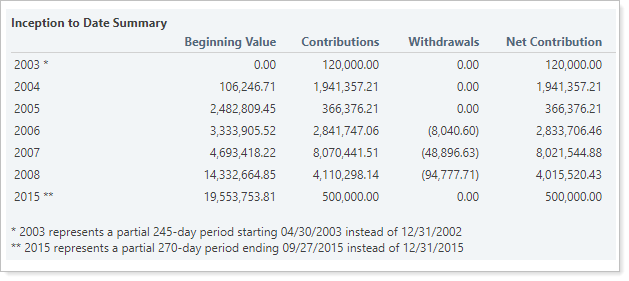 Only date periods with flows are displayed. Notice the gap between 2008 and 2015, indicating no flows occurred during those interim years.