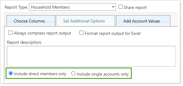 Select Include direct members only to see all direct members within the Households, including single accounts and groups.
