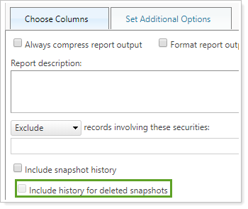 Use this bulk report setting to include or exclude deleted snapshots in the bulk report. This setting is only available when you select Include snapshot history. By default, it is cleared.
