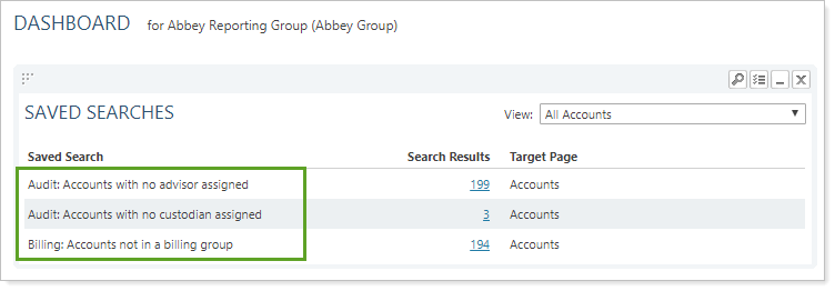 Use this saved searches setting to quickly add a saved search to or remove a saved search from the Saved Searches dashboard widget on the Reporting dashboard. For more information about Saved Searches on the Reporting dashboard, see Saved Searches Dashboard Module.