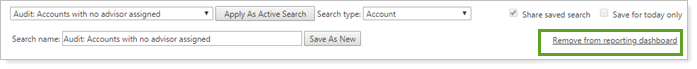 To remove a saved search from the Reporting dashboard, click Remove from reporting dashboard.