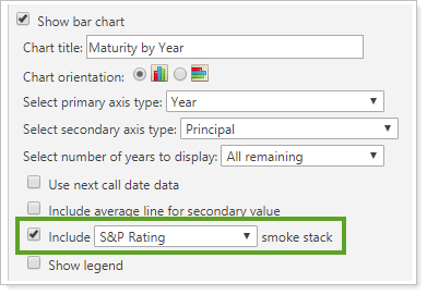 This setting lets you show the proportion of each rating type comprising each data point total on the Bond Analysis bar chart. When you select this check box, you also choose from a drop-down list which rating agency's ratings you want to see.