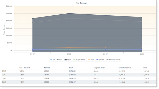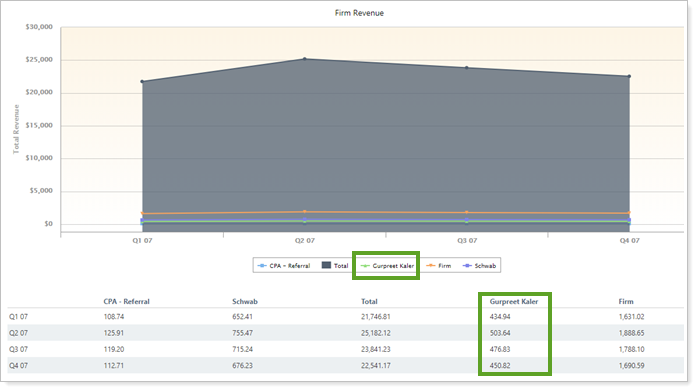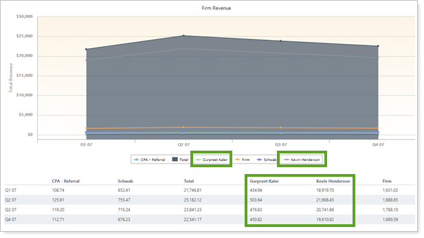 To see revenue split out by individual advisors, select Show Advisor Revenue Breakdown. The chart displays one line for each user, labeled with the user's name. The table displays one column for each user, also labeled by name.