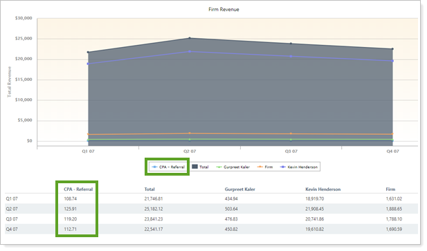 In this example, the Other payee CPA - Referral is included, while all Other payees are hidden. Notice that some payees—Advisors, Total, and Firm—are also still displayed. Showing or hiding these are displayed in the following settings: |