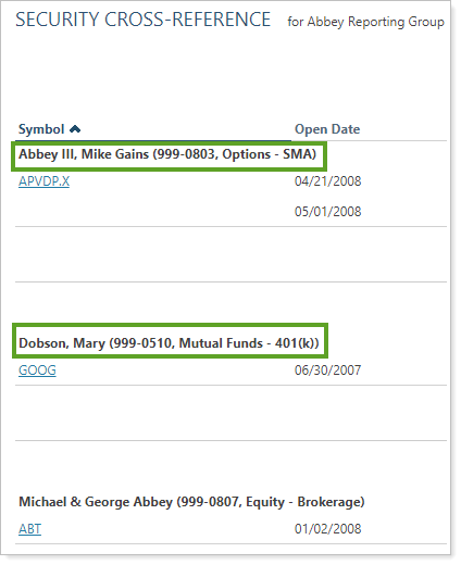 You might choose to use this setting if you want to exclude all SMAs from the list of accounts on the Security Cross-Reference report, since you may not determine what securities are held in those accounts and thus may want to exclude them from lists of assets you manage.