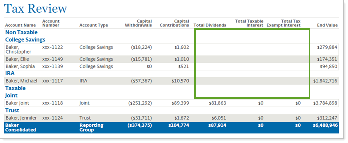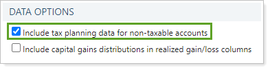 Use this setting to control whether the Comparative Review PDF report displays tax-related data points like dividends, interest, capital gains distributions for non-taxable accounts. You only see this option when you set Reporting data type to Tax planning data.