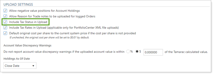 Upload Settings on the Rebalancing System Settings page allow you to change how Tamarac Trading treats some of the information you add through upload. The Include Tax Status in Upload option lets you choose if Tamarac Trading will include tax status when you upload account data.