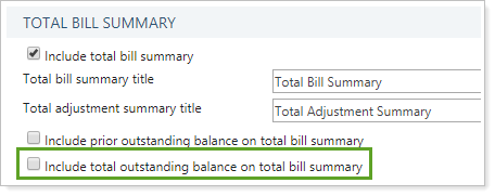 The Include total outstanding balance on total bill summary check box will display the sum of the two prior outstanding balances, a total of $200.