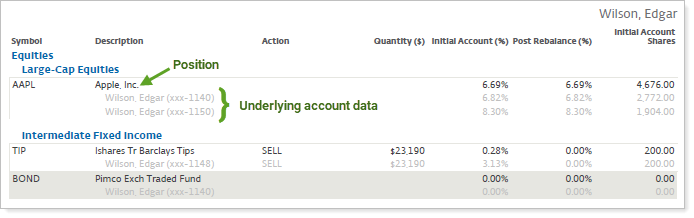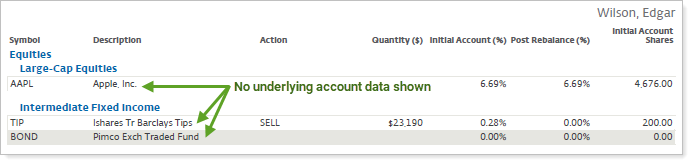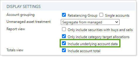 Include underlying account data controls how the underlying data of individual accounts is shown in the Rebalance Summary Details PDF report. This setting works in conjunction with Account grouping because this setting applies to groups. If you select only Single accounts in Account grouping, Include underlying account data won't be available to select.