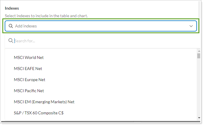 Indexes let you compare the performance of assets under your management with appropriate segments of the market. Use this setting to add indexes to the Account Performance report page.