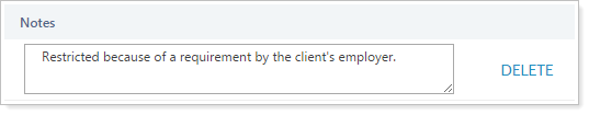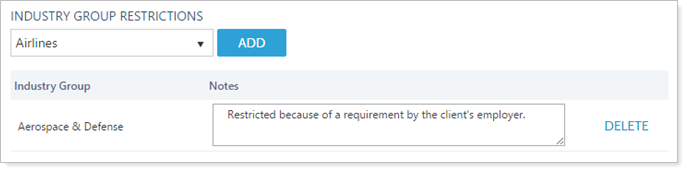 The Notes box allows you to add a note giving further information about the restriction. Click Delete to remove an existing industry restriction.