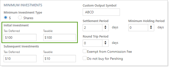 Initial Investment and Subsequent Investments settings are used to specify investment minimums dictated by the fund at the individual account level, not at the firm level.