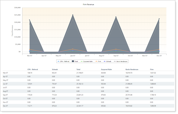 This setting allows you to designate how the included billing histories are aggregated chronologically in the chart and table. For example, you can choose to see revenue aggregated monthly if you want to closely track individual advisors' revenue goals, or you can see revenue aggregated annually when looking at firm-wide revenue.