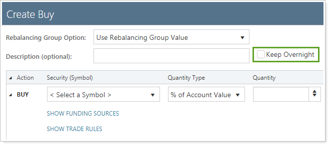 Select Keep Overnight to save the directed trade for tomorrow. When selected, this option saves quantity, quantity type, funding source, buy priority, and other trade parameters overnight. When cleared, your directed trade will not be saved overnight.