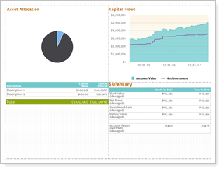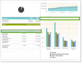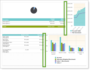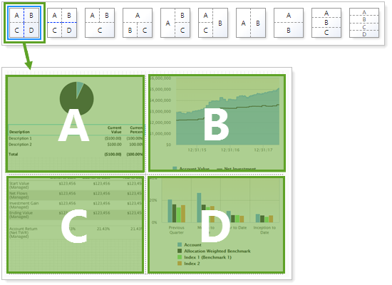 When choosing layout, consider what reports you want to include. Some reports, such as the asset allocation pie chart, fit better in square panels, while others, like a performance bar chart, fit better in rectangular spaces.