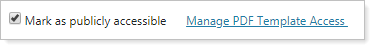 Select this check box to allow others to see this PDF report template, if they have the appropriate permissions set by your administrator on the User Management page. When you select Mark as publicly accessible, the Manage PDF Template Access link appears. Use this link to manage permissions for PDF templates directly.