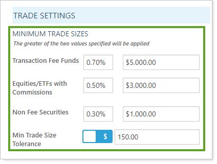 Enter a dollar and/or percentage value for the minimum trade size you'll allow for mutual funds that do not have transaction fees and ETFs and equities that do not have commissions. Also included in this category are bonds, LPs, private placements, and separately managed accounts. |